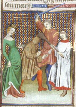 Londra, British Library, Royal 20 C V, f. 52v. Clitennestra osserva Egisto uccidere Agamennone con l'aiuto di un servitore.