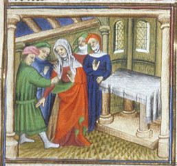 Londra, British Library, Royal 20 C V, f. 99v. Virginia viene assalita da un gruppo di uomini nel tempio della Pudicizia.