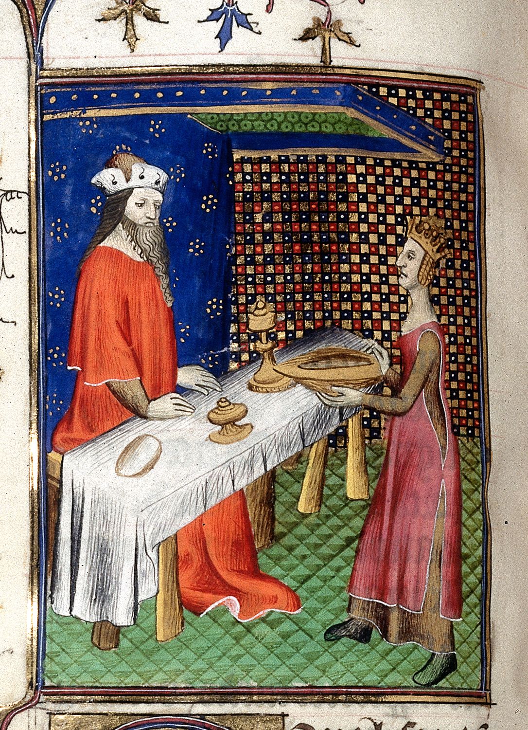 Londra, British Library, Royal 20 C V, f. 116v. Dripertua, caratterizzata dal naso mostruosamente grande, serve Mitridate seduto a tavola.