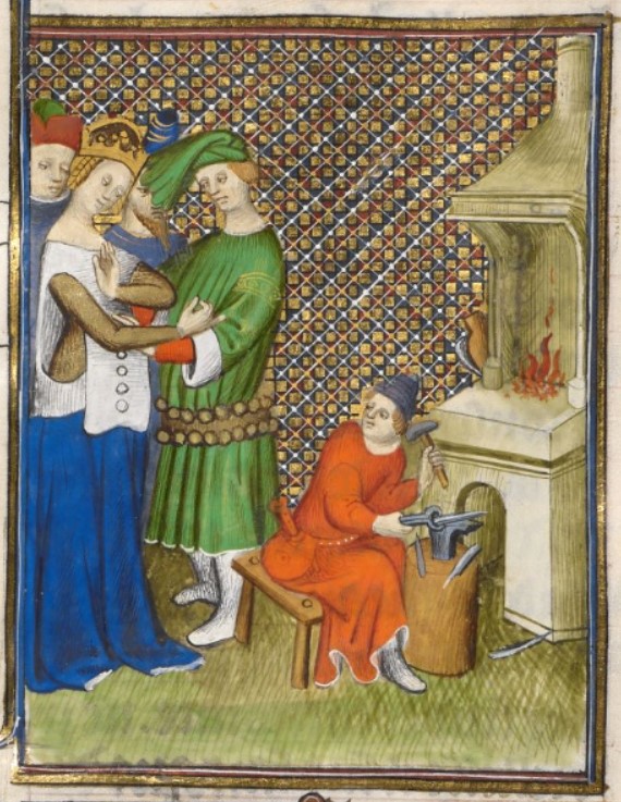 Londra, British Library, Royal 20 C V, f. 149r. Faustina insieme a tre amanti; un orafo forgia delle monete su un'incudine.