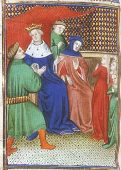 Londra, British Library, Royal 20 C V, f. 158v. L'imperatore Ottone ordina il matrimonio tra Gualdrada e il conte Guido.