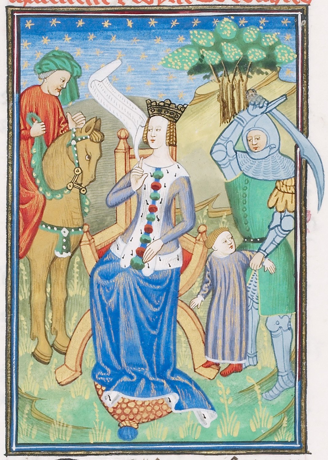 Londra, British Library, Royal 16 G V, f. 20r. Medea, seduta sul trono con una pergamena tra le mani, ordina ad un soldato di uccidere il figlio avuto con Giasone, il quale sopraggiunge a cavallo sulla sinistra.