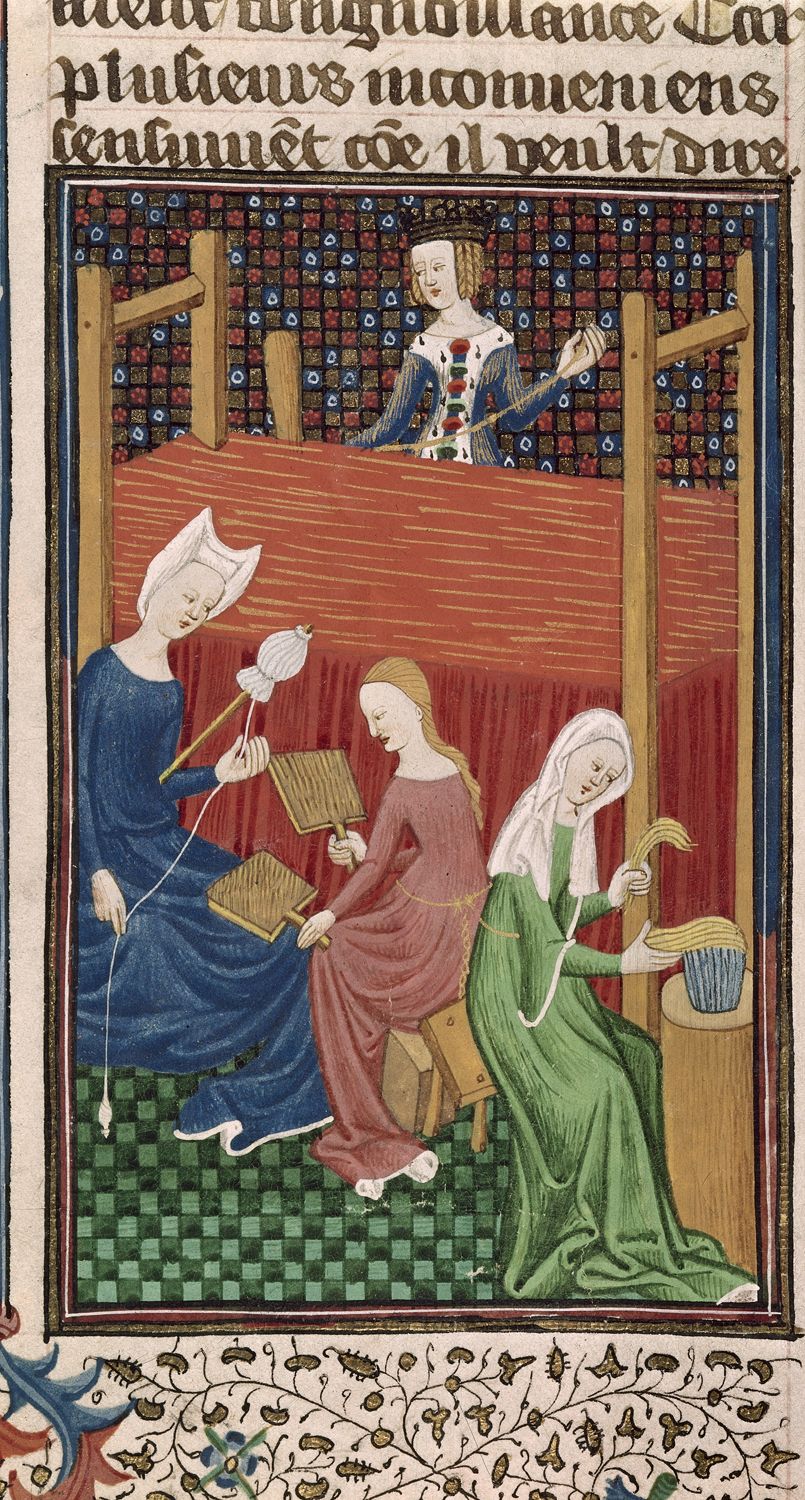 Londra, British Library, Royal 16 G V, f. 56r. Gaia Cirilla lavora al telaio in compagnia di tre donne che filano, tessono e cardano.