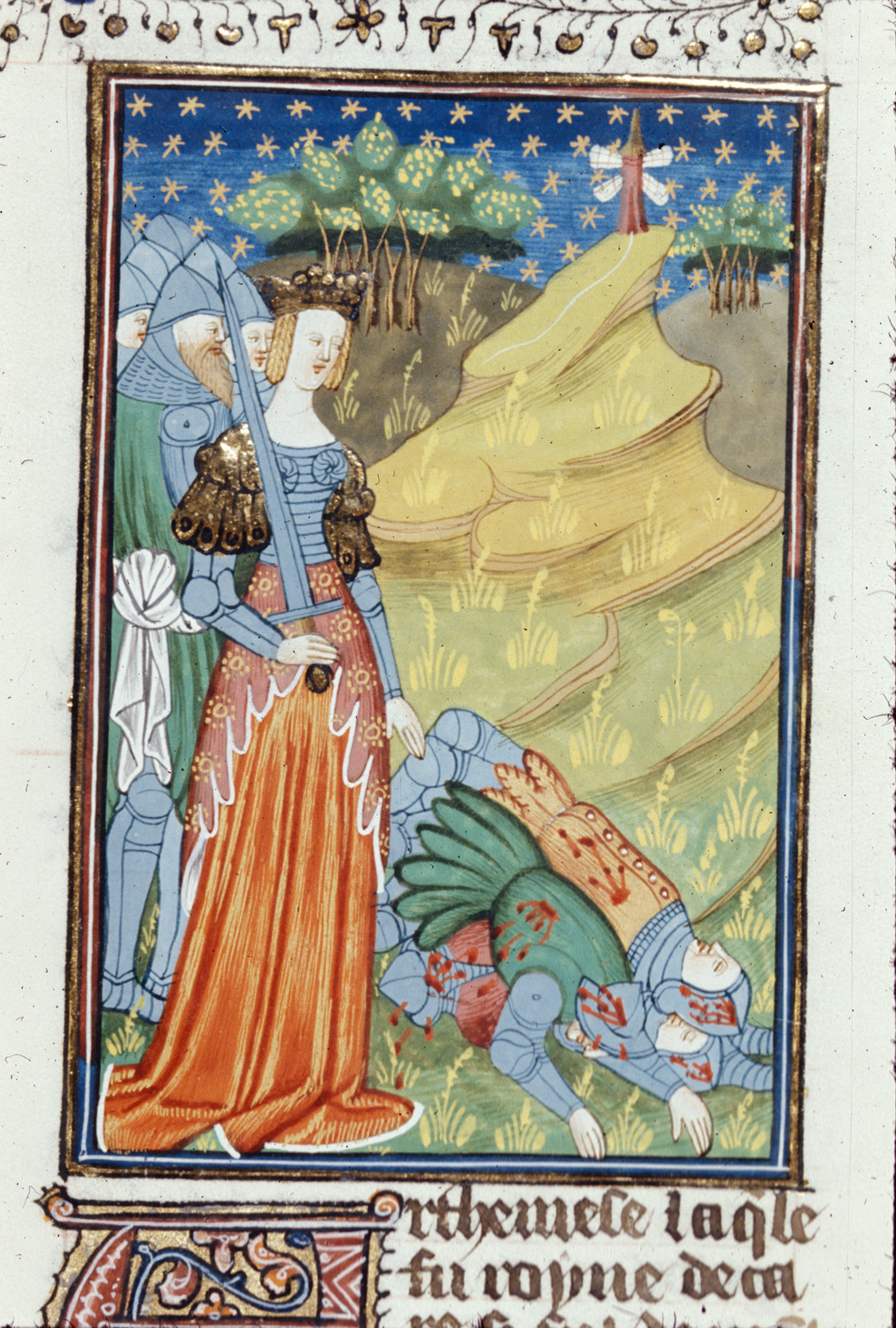 Londra, British Library, Royal 16 G V, f. 69r. Artemisia, in armatura e armata di spada, guida l'esercito contro gli abitanti di Rodi.