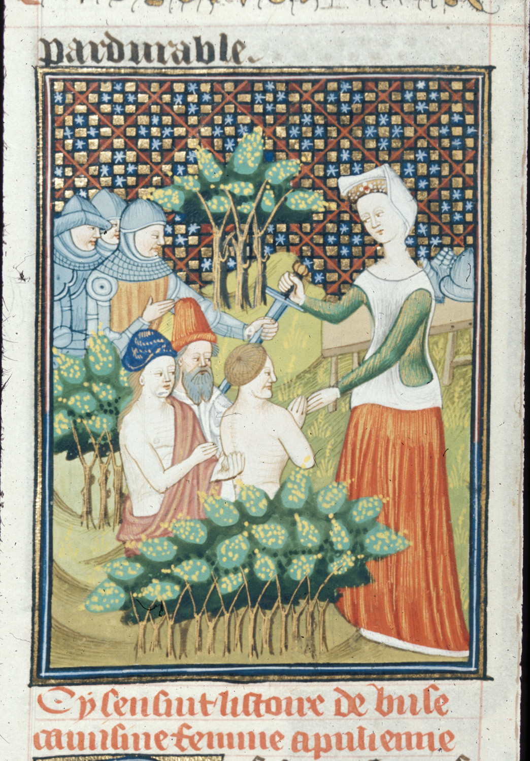 Londra, British Library, Royal 16 G V, f. 82v. Busa di Canosa distribuisce armi ai soldati romani sopravvissuti alla battaglia di Canne.