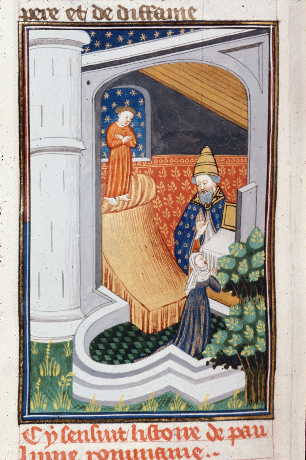 Londra, British Library, Royal 16 G V, f. 105v. Paolina, in preghiera dinanzi all'altare nel tempio di Iside, viene corteggiata dal sacerdote Mondo; un personaggio dalla veste rossa sta in piedi su un letto (?).