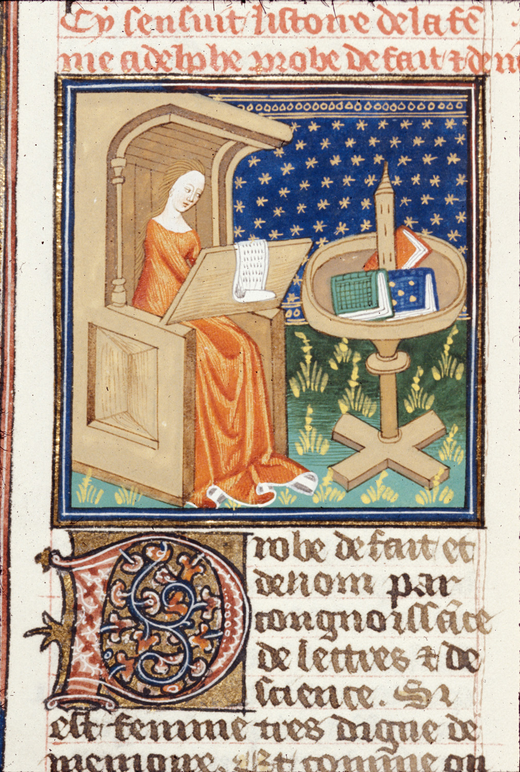 Londra, British Library, Royal 16 G V, f. 113v. Proba seduta in cattedra con i suoi libri.