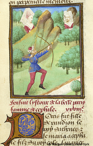 New York, Pierpont Morgan Library, M 381, f. 16r. Procri si nasconde in un cespuglio nella foresta; Procri viene ferita mortalmente dal marito Cefalo con una freccia.