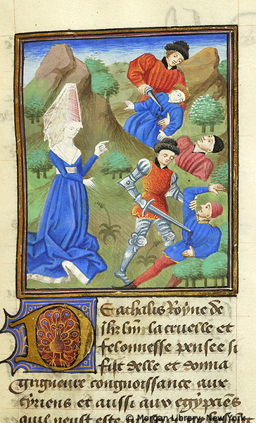 New York, Pierpont Morgan Library, M 381, f. 28r. Atalia, regina di Gerusalemme, ordina il massacro di tutti i discendenti maschi della stirpe di David.