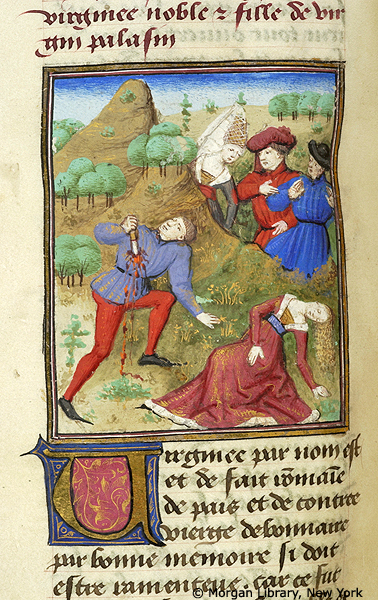 New York, Pierpont Morgan Library, M 381, f. 36v. Virginio uccide la figlia Virginia prima di pugnalarsi a sua volta (?); sullo sfondo è raffigurato l'episodio precedente, in cui Appio e Marco Claudio tentano di rapire la fanciulla.