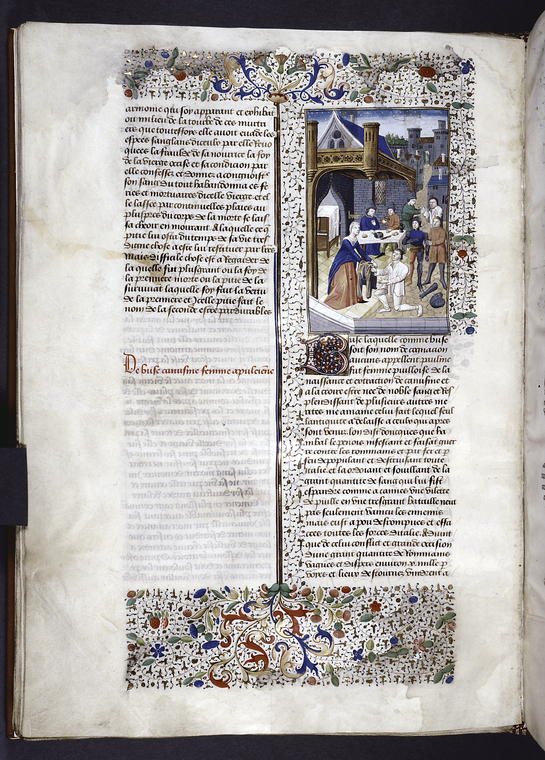 New York, Public Library, Spencer 33, f. 39v. Busa di Canosa distribuisce cibo e vestiti ai soldati romani.