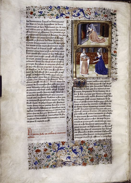 New York, Public Library, Spencer 33, f. 50v. Porzia si ferisce il braccio con un pugnale dinanzi a Bruto; Porzia, inginocchiata di fronte a un camino, mangia i carboni adenti.