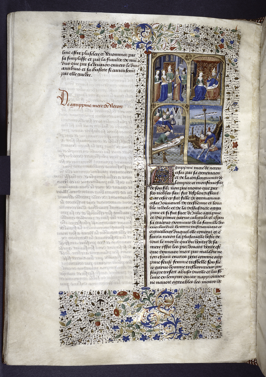 New York, Public Library, Spencer 33, f. 58v. Agrippina sposa l'imperatore Claudio; Agrippina siede sul trono accanto al figlio Nerone; Agrippina viene salvata dall'annegamento da due uomini su una barca; Nerone ordina che il cadavere della madre venga fatto a pezzi.