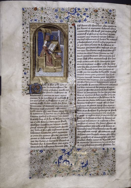 New York, Public Library, Spencer 33, f. 64v. Proba sfoglia un manoscritto seduta nel suo studio.