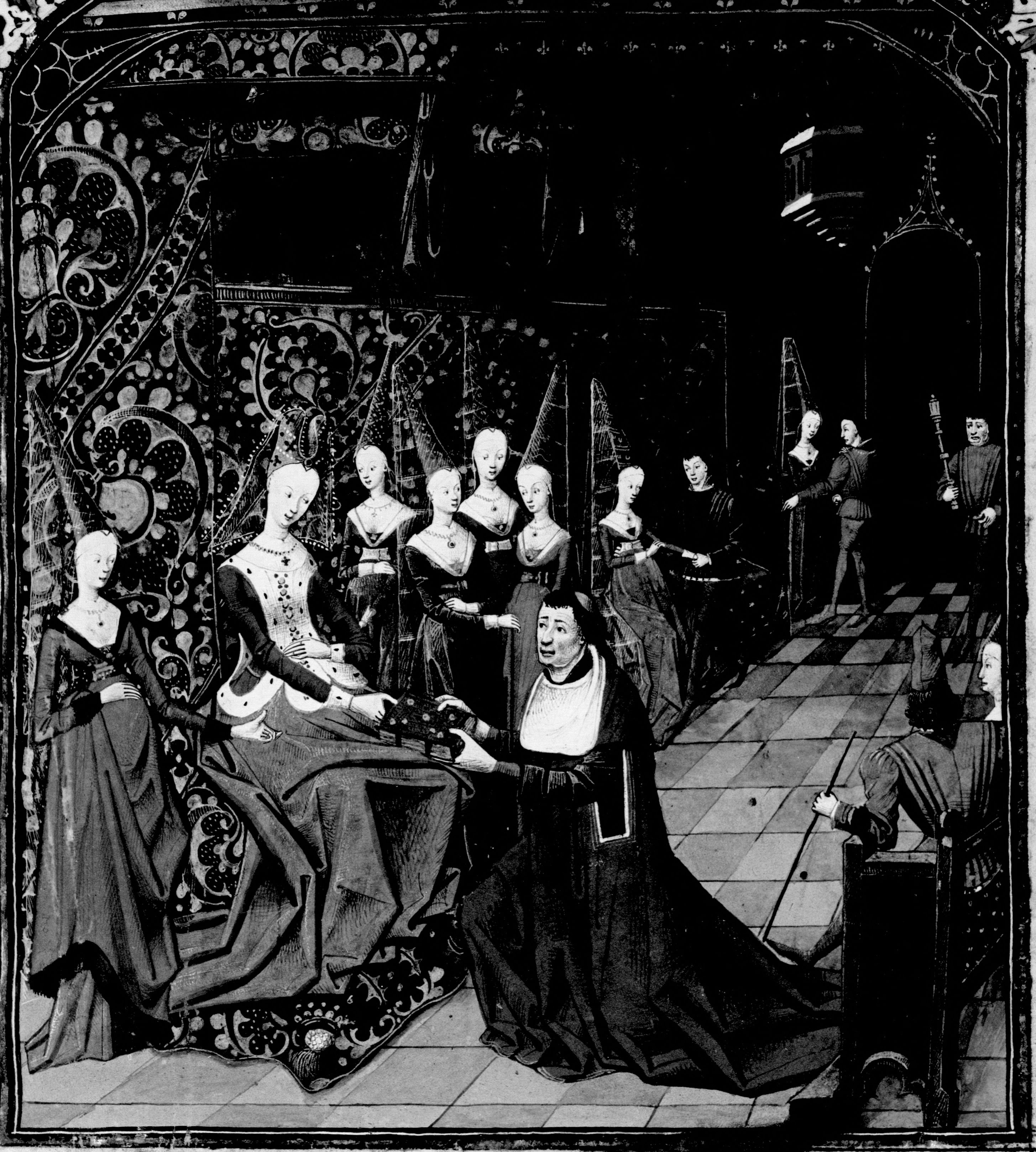 Parigi, Bibliothèque Nationale de France, Fr. 133, f. 2r. L'autore Giovanni Boccaccio offre il libro alla contessa d'Altavilla, circondata dal suo seguito.
