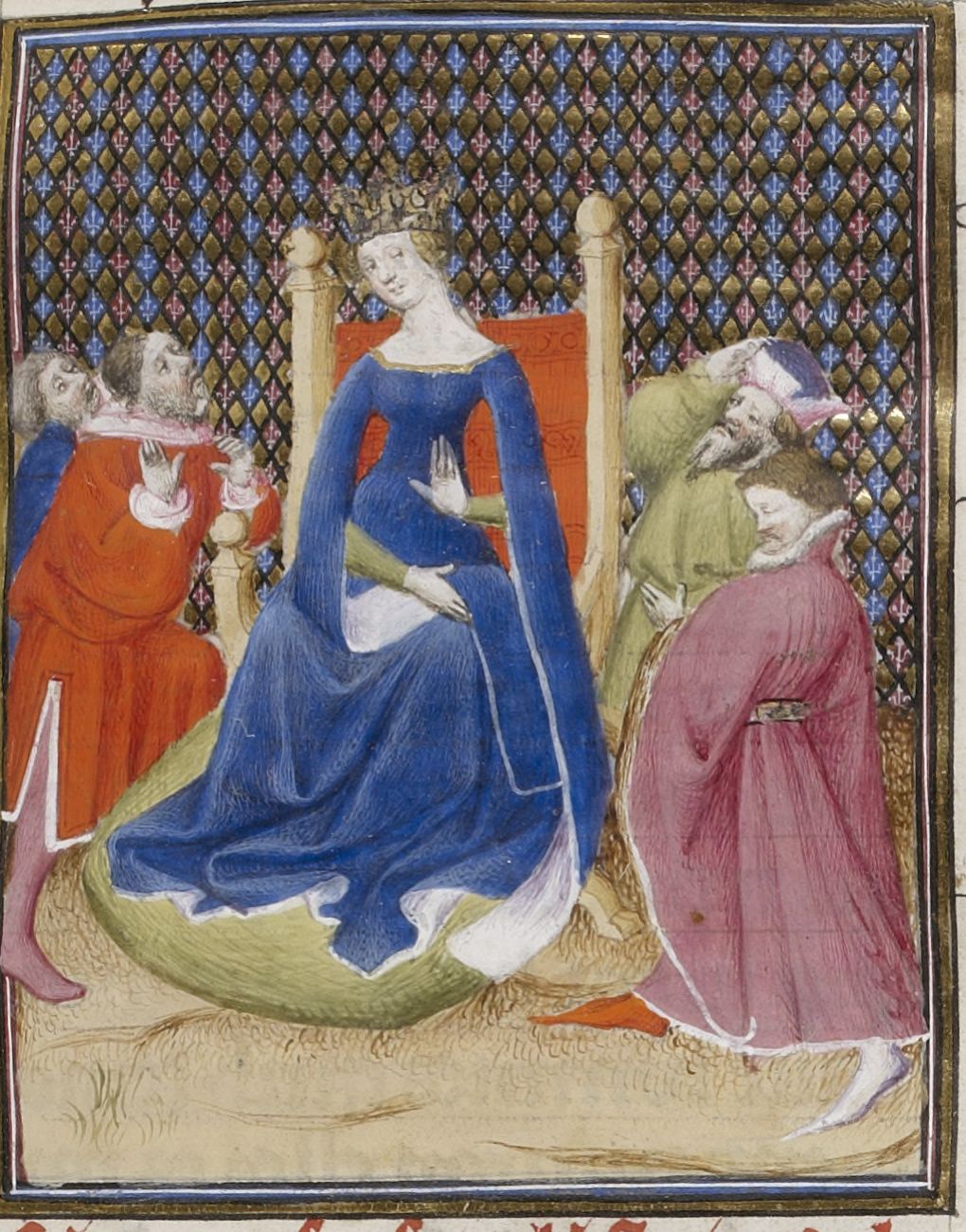 Parigi, Bibliothèque Nationale de France, Fr. 598, f. 19r. Libia siede sul trono circondata da una folla di ammiratori.