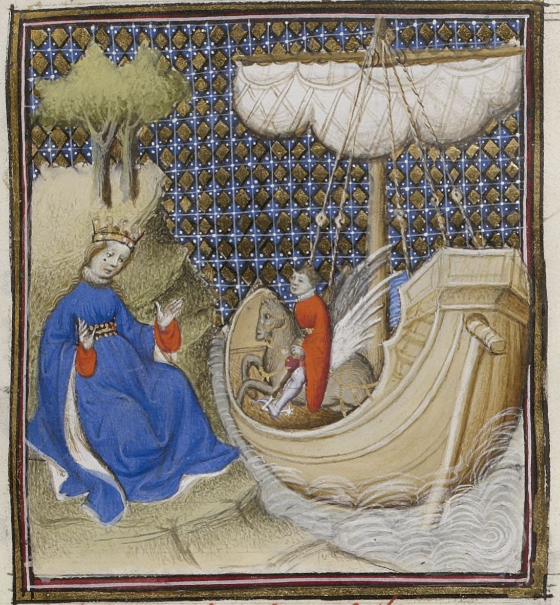 Parigi, Bibliothèque Nationale de France, Fr. 598, f. 32r. Perseo sbarca a cavallo di Pegaso sulla spiaggia dove lo attende Medusa.