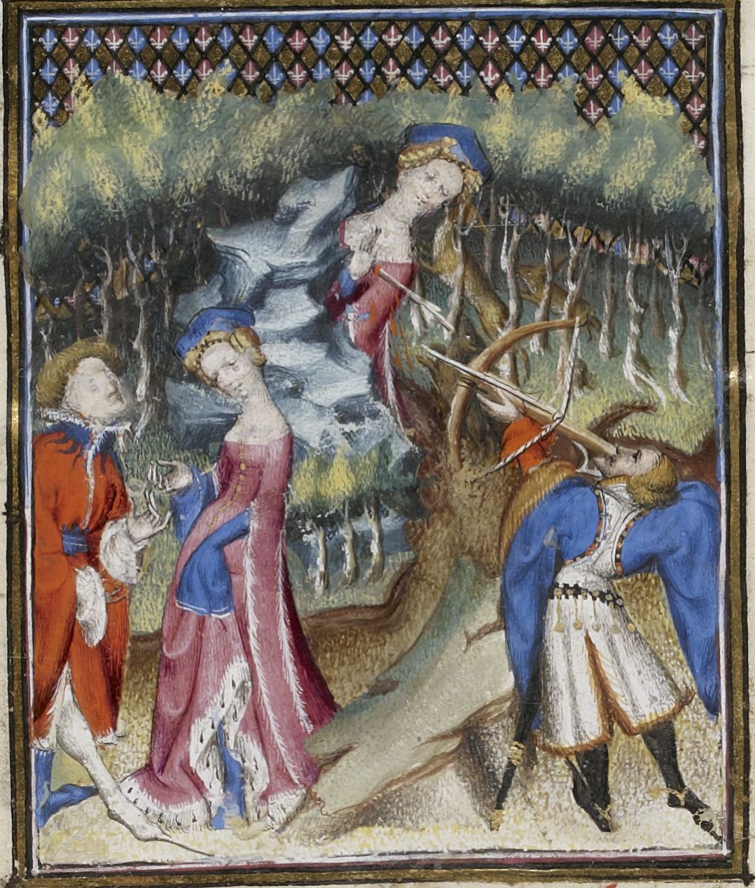 Maestro delle Clères Femmes e collaboratore (1403 c.), Cefalo tenta di corrompere Procri; Procri viene ferita mortalmente da Cefalo