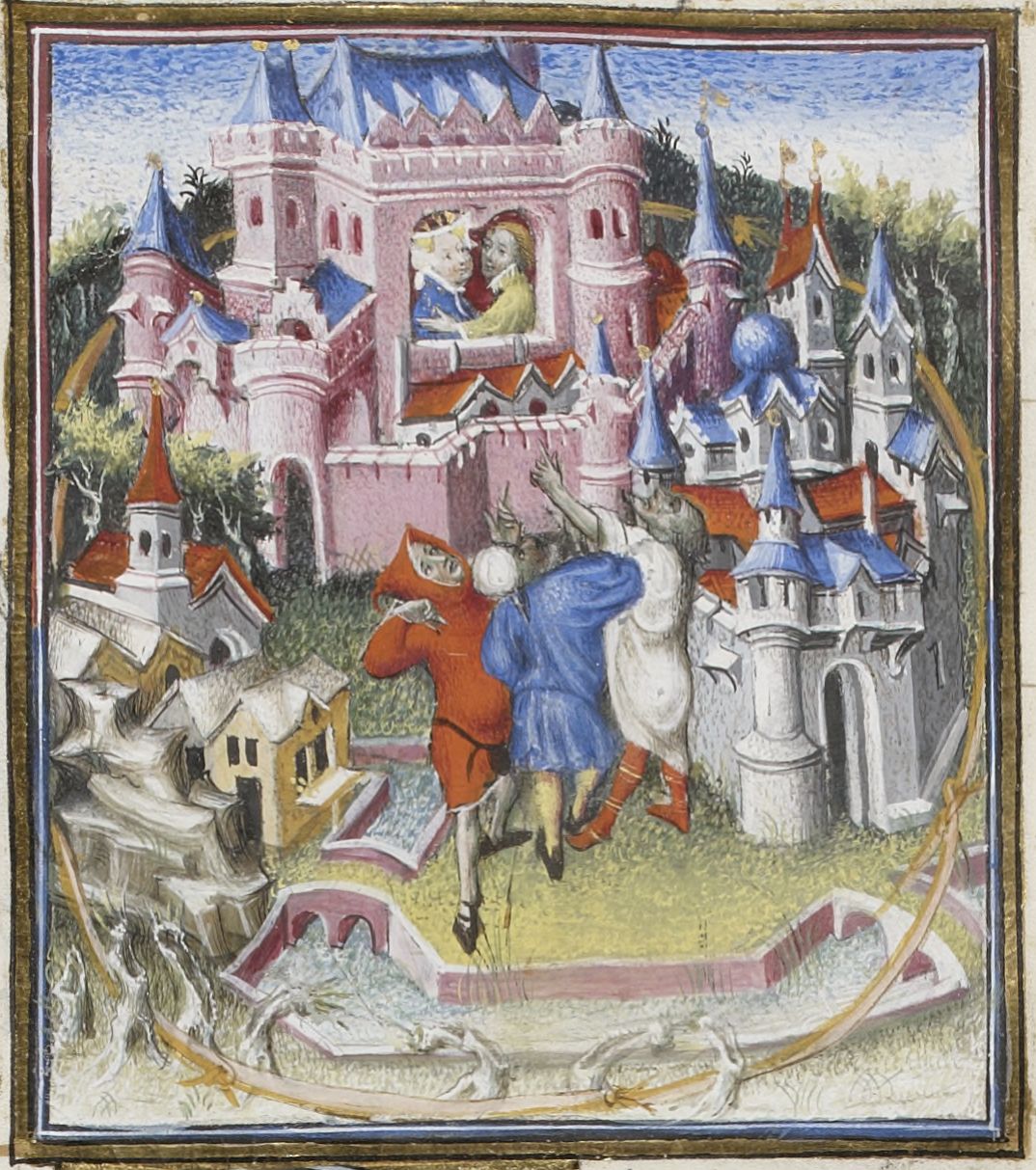 Parigi, Bibliothèque Nationale de France, Fr. 598, f. 61v. Didone ed Enea si trovano in un palazzo all'interno della città di Cartagine, i cui confini sono segnati da strisce di pelle di bue; all'esterno del palazzo si trovano tre uomini.