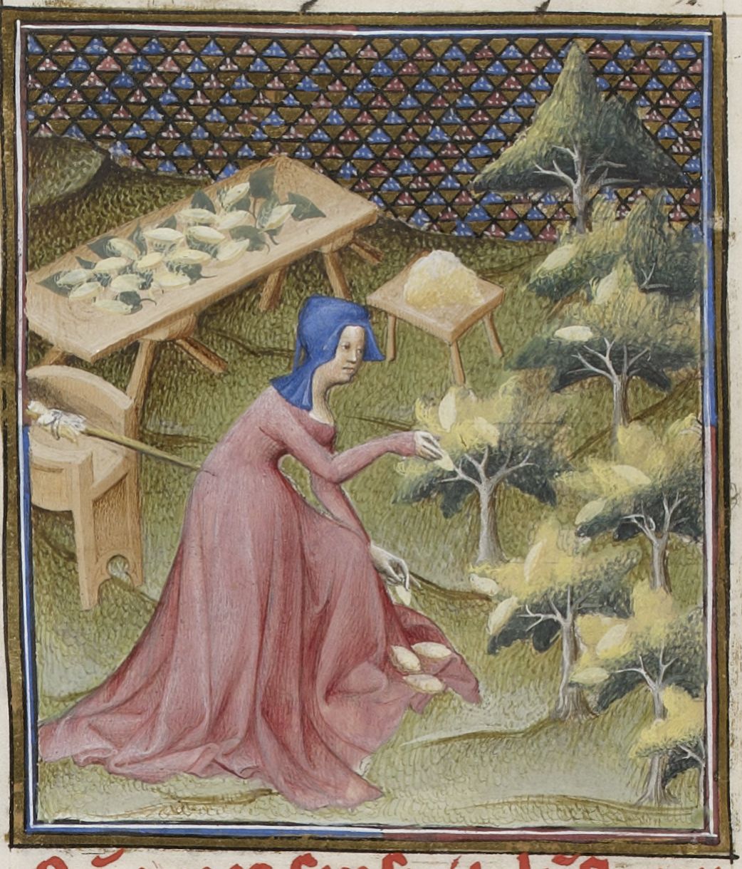 Parigi, Bibliothèque Nationale de France, Fr. 598, f. 68v. Panfila raccoglie i bozzoli dei bachi da seta.