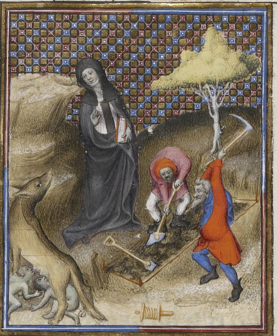 Maestro delle Clères Femmes e collaboratore (1403 c.), Rea Silvia accanto a due uomini che scavano la fossa dove sarà sepolta viva