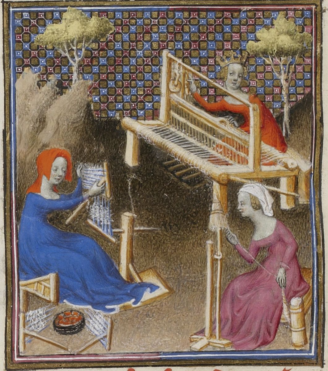 Parigi, Bibliothèque Nationale de France, Fr. 598, f. 70v. Gaia Cirilla lavora al telaio in compagnia di due donne che filano, tessono e cardano.