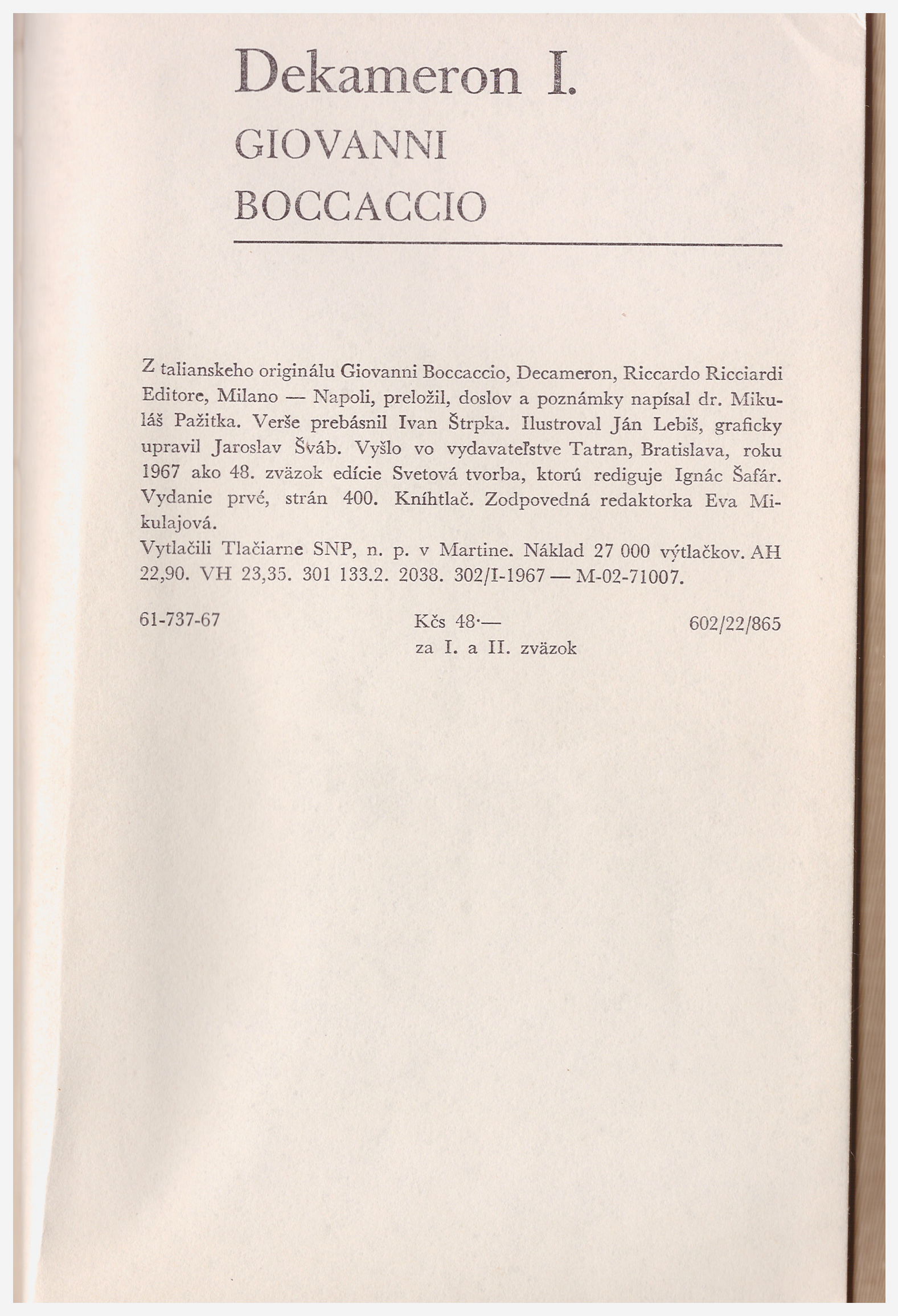 Dekameron. I / preložil, doslov a poznámky napísal dr. Mikuláš Pažitka ; ilustroval Ján Lebiš