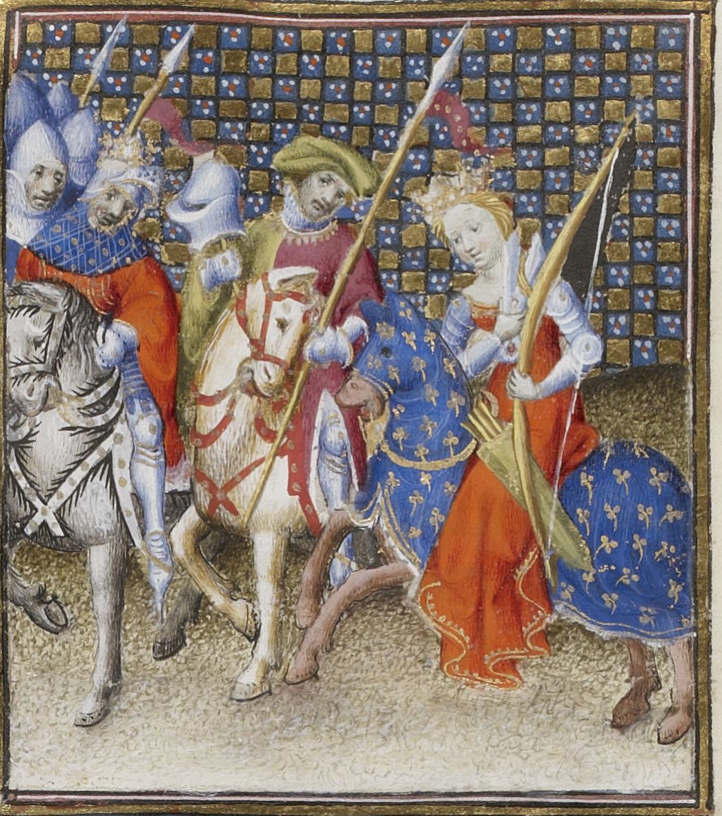 Parigi, Bibliothèque Nationale de France, Fr. 598, f. 116r. Ipsicratea, armata di arco e frecce, segue il marito in battaglia.