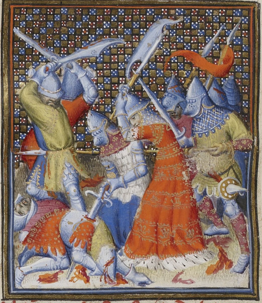 Parigi, Bibliothèque Nationale de France, Fr. 598, f. 142v. Triaria si unisce ai soldati in battaglia.