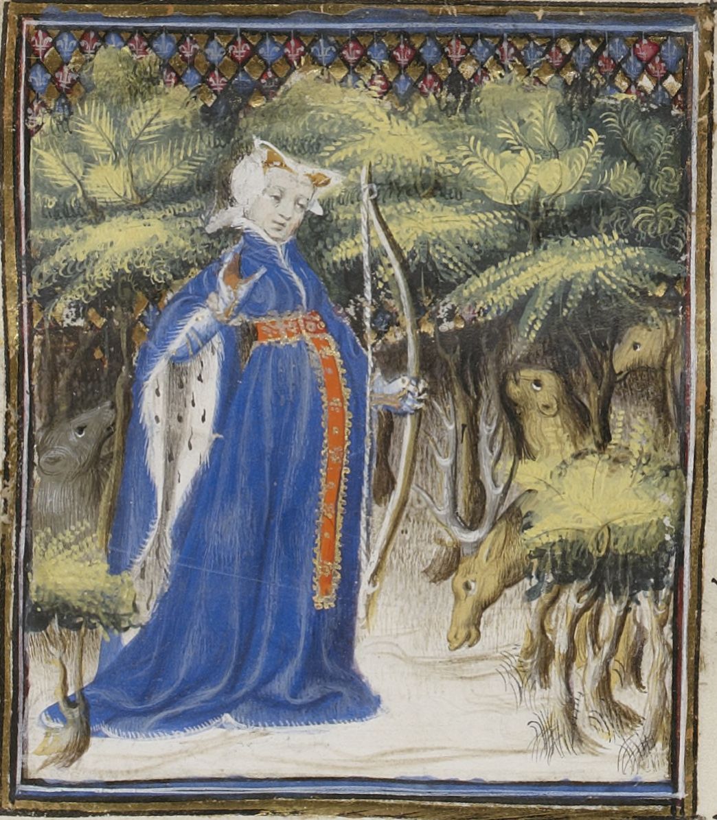 Parigi, Bibliothèque Nationale de France, Fr. 598, f. 148r. Zenobia a caccia con l'arco in un bosco.