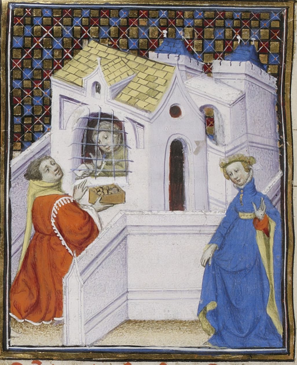 Parigi, Bibliothèque Nationale de France, Fr. 598, f. 155v. Camiola fornisce il denaro per pagare il riscatto del principe Rolando in cambio di una promessa di matrimonio.