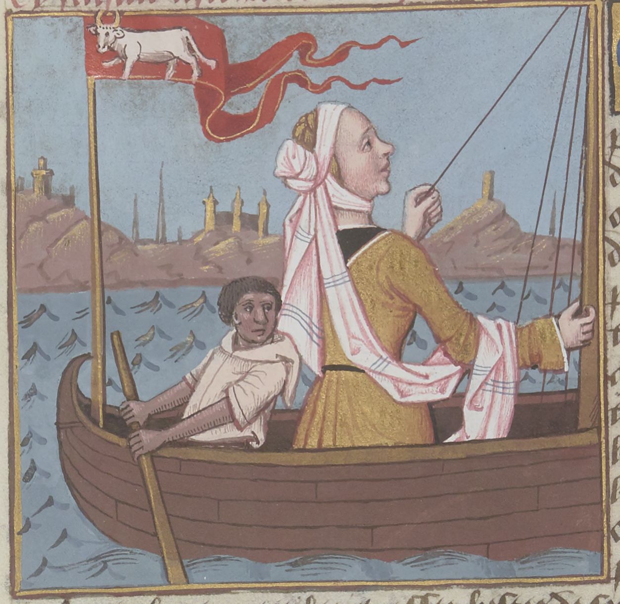 Parigi, Bibliothèque Nationale de France, Fr. 599, f. 11v. Il copista del manoscritto è Johannes Michel. Europa viaggia su una nave su cui è issato un vessillo rosso con un toro bianco.