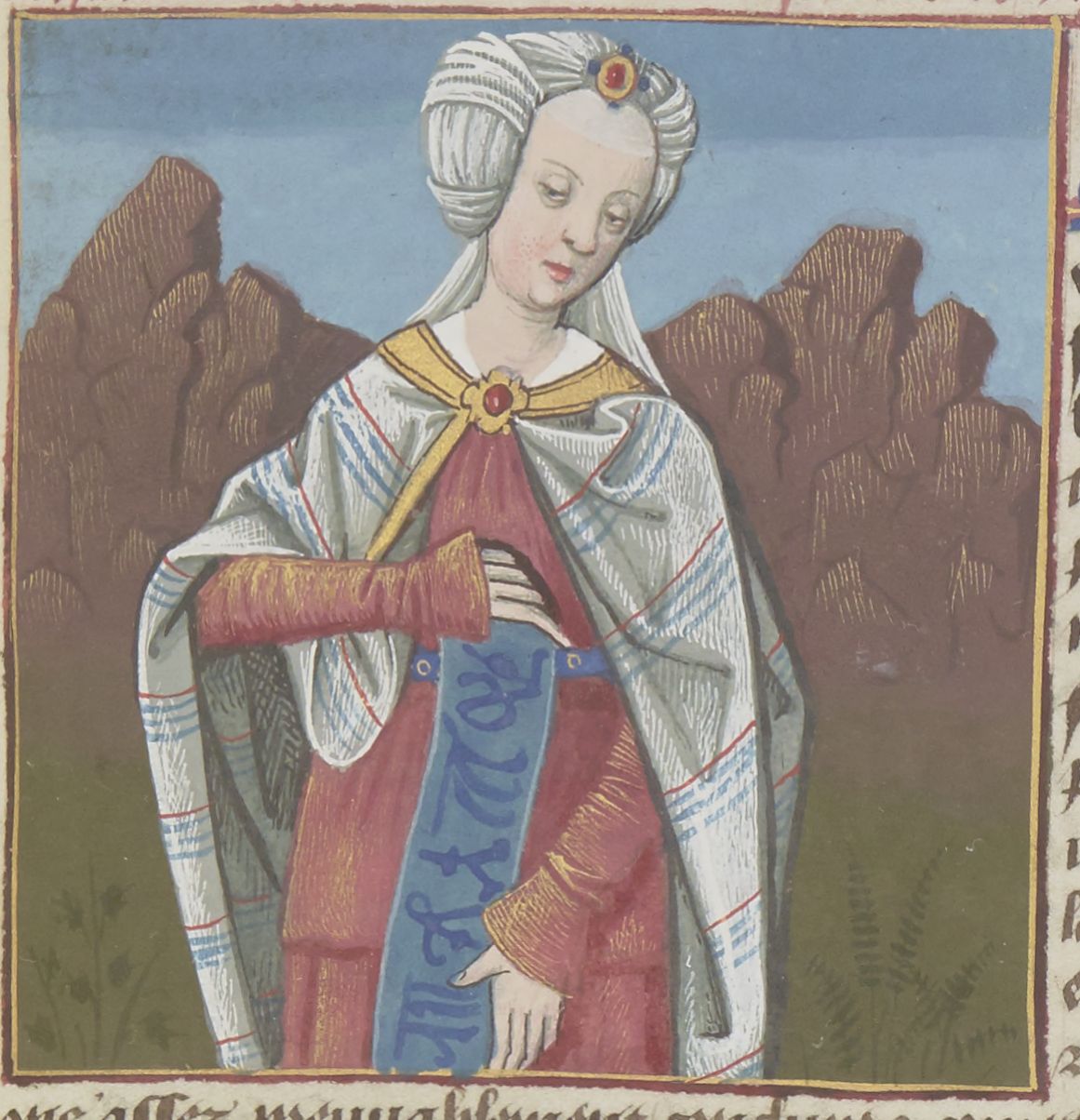 Parigi, Bibliothèque Nationale de France, Fr. 599, f. 12r. Il copista del manoscritto è Johannes Michel. La regina Libia con un filatterio tra le mani.