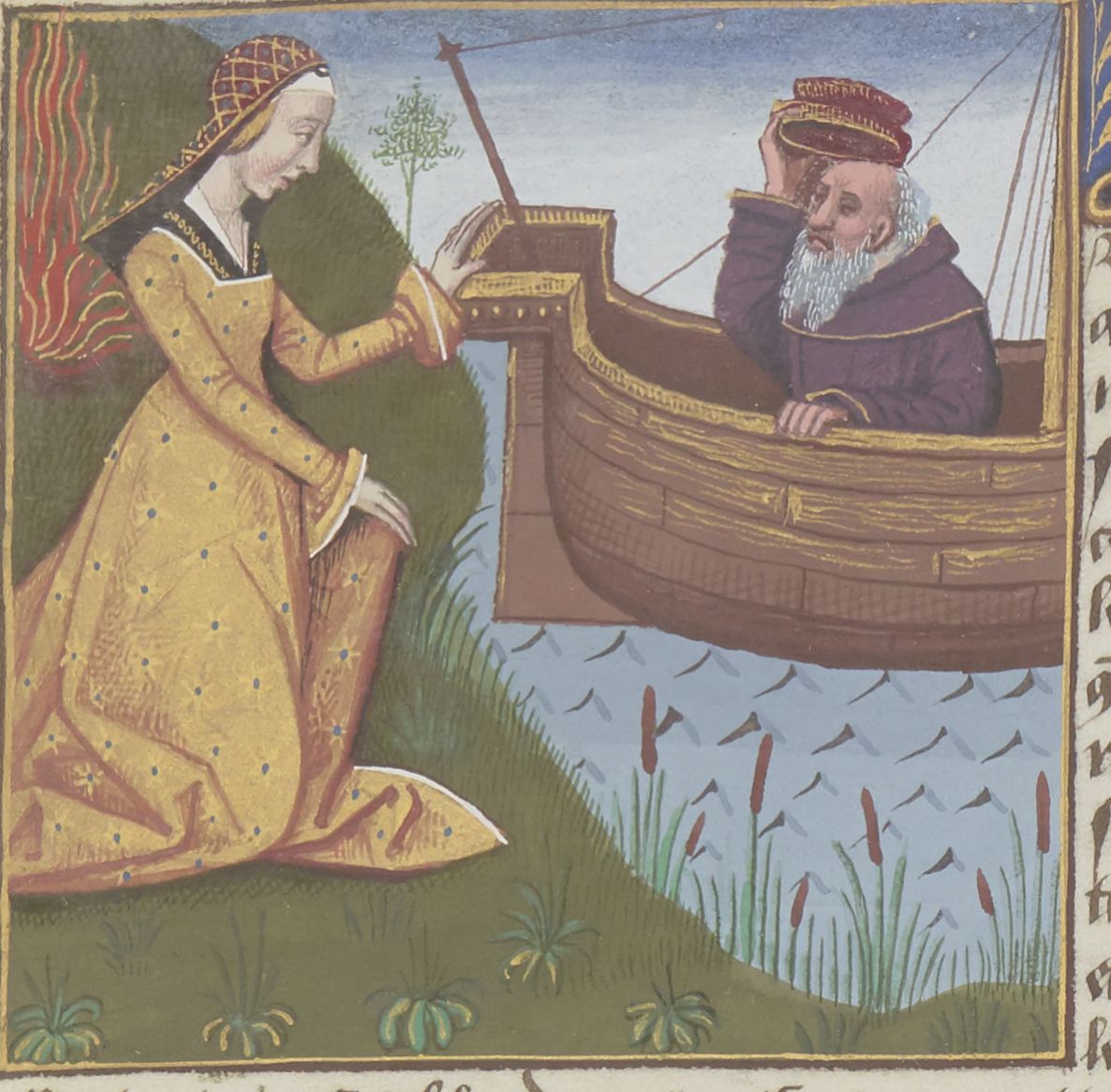 Parigi, Bibliothèque Nationale de France, Fr. 599, f. 16r. Il copista del manoscritto è Johannes Michel. Isifile fa fuggire il padre Toante su una barca.