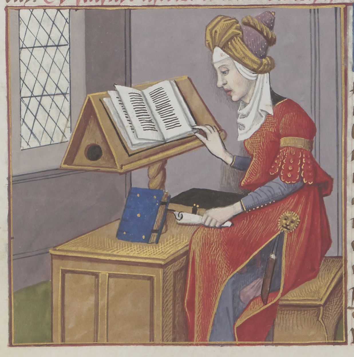 Parigi, Bibliothèque Nationale de France, Fr. 599, f. 18v. Il copista del manoscritto è Johannes Michel. La sibilla Eritrea sfoglia un manoscritto seduta al leggio.