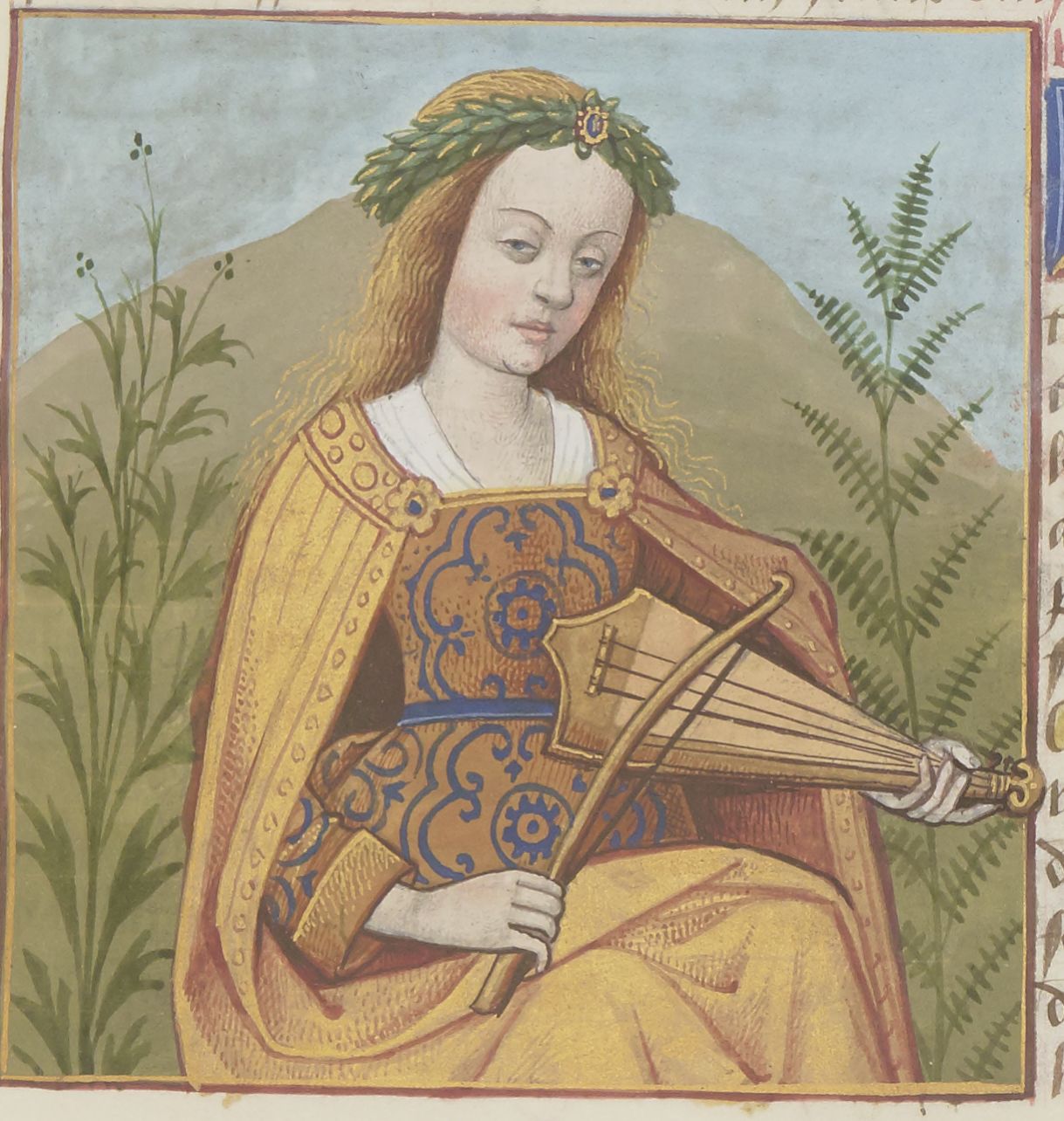 Parigi, Bibliothèque Nationale de France, Fr. 599, f. 19r. Il copista del manoscritto è Johannes Michel. Medusa suona il liuto.
