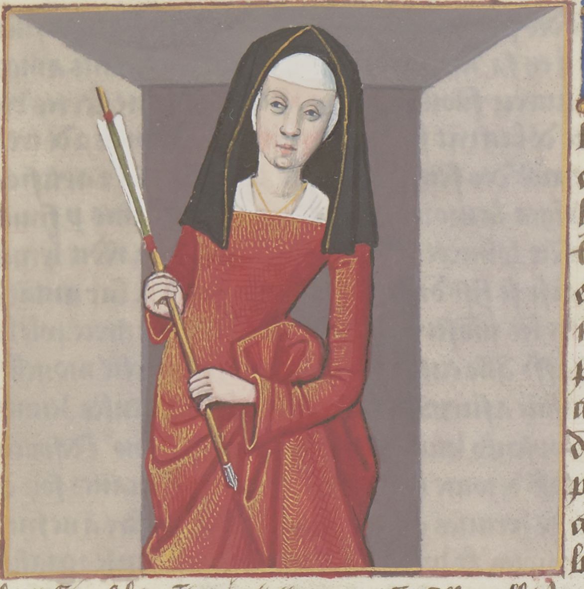 Parigi, Bibliothèque Nationale de France, Fr. 599, f. 20r. Il copista del manoscritto è Johannes Michel. Iole con una freccia tra le mani.