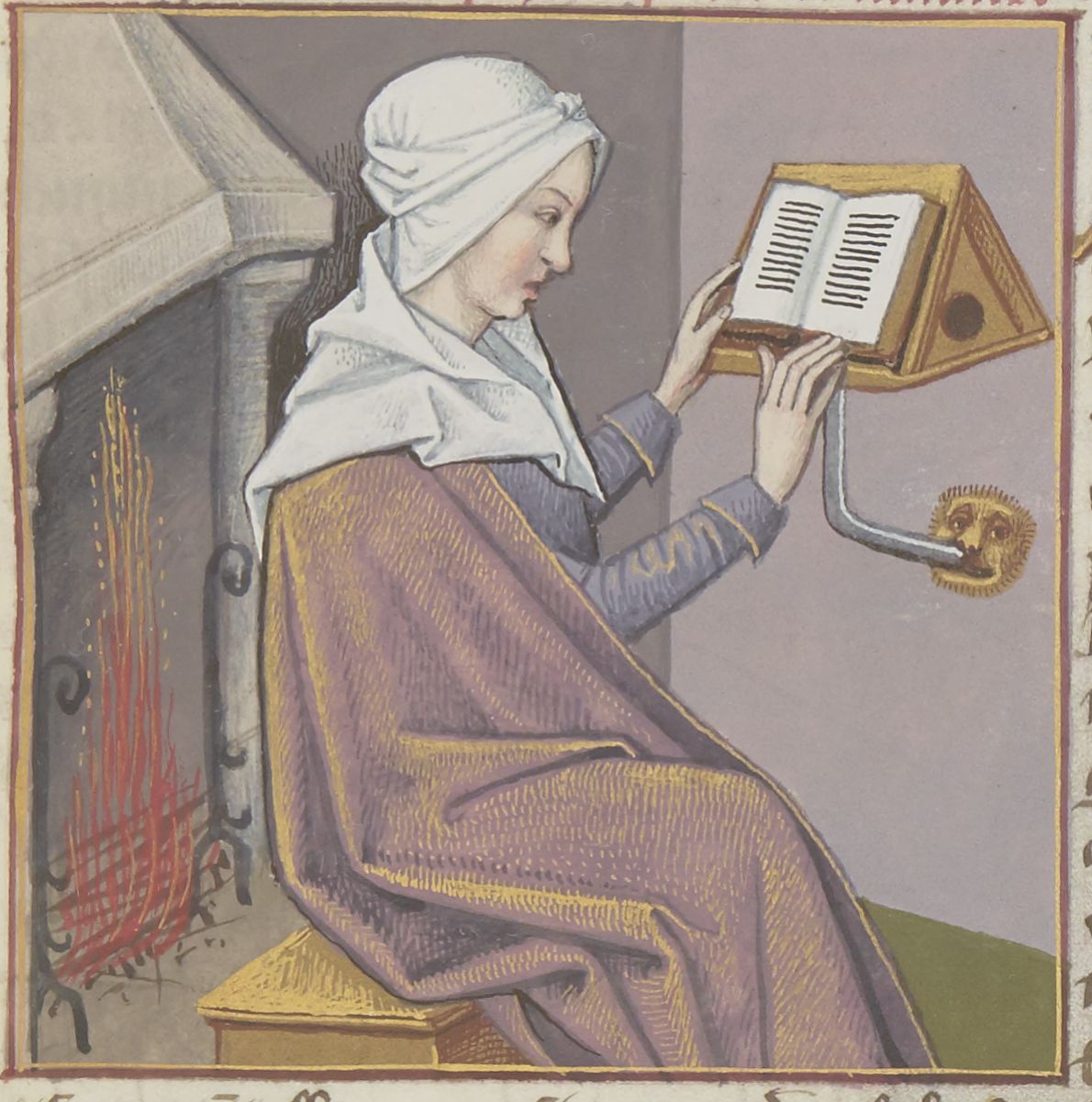 Parigi, Bibliothèque Nationale de France, Fr. 599, f. 22r. Il copista del manoscritto è Johannes Michel. La sibilla Amaltea legge un libro seduta accanto ad un camino.
