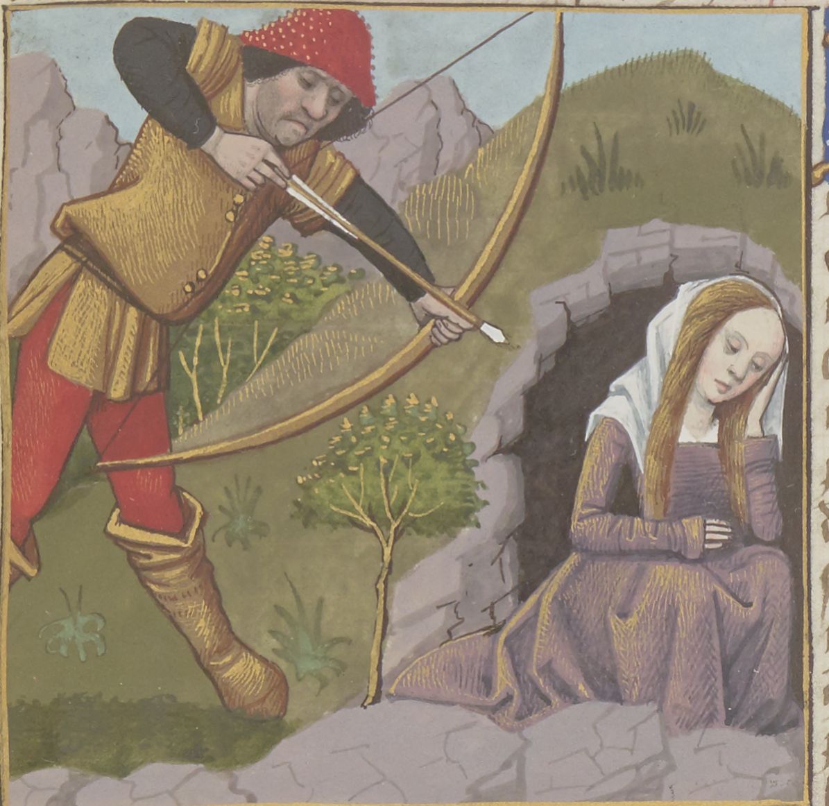 Parigi, Bibliothèque Nationale de France, Fr. 599, f. 24r. Il copista del manoscritto è Johannes Michel. Procri, nascosta in una caverna, viene ferita mortalmente dal marito Cefalo con una freccia.