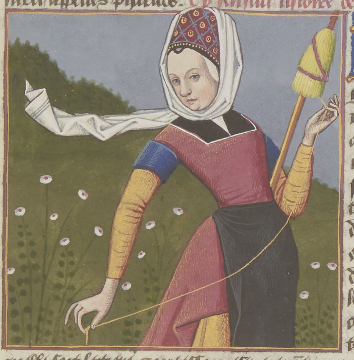 Parigi, Bibliothèque Nationale de France, Fr. 599, f. 40r. Il copista del manoscritto è Johannes Michel. Panfila fila la seta.
