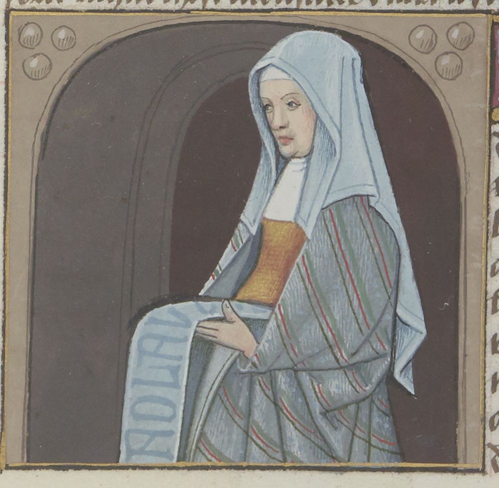 Parigi, Bibliothèque Nationale de France, Fr. 599, f. 53v. Il copista del manoscritto è Johannes Michel. La filosofa Leonzio con una pergamena.