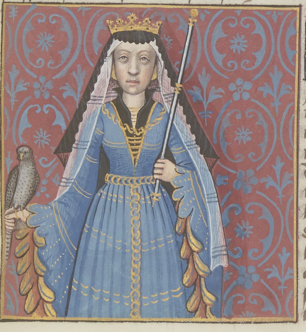 Parigi, Bibliothèque Nationale de France, Fr. 599, f. 54r. Il copista del manoscritto è Johannes Michel. La regina Olimpiade con uno scettro e un falcone.