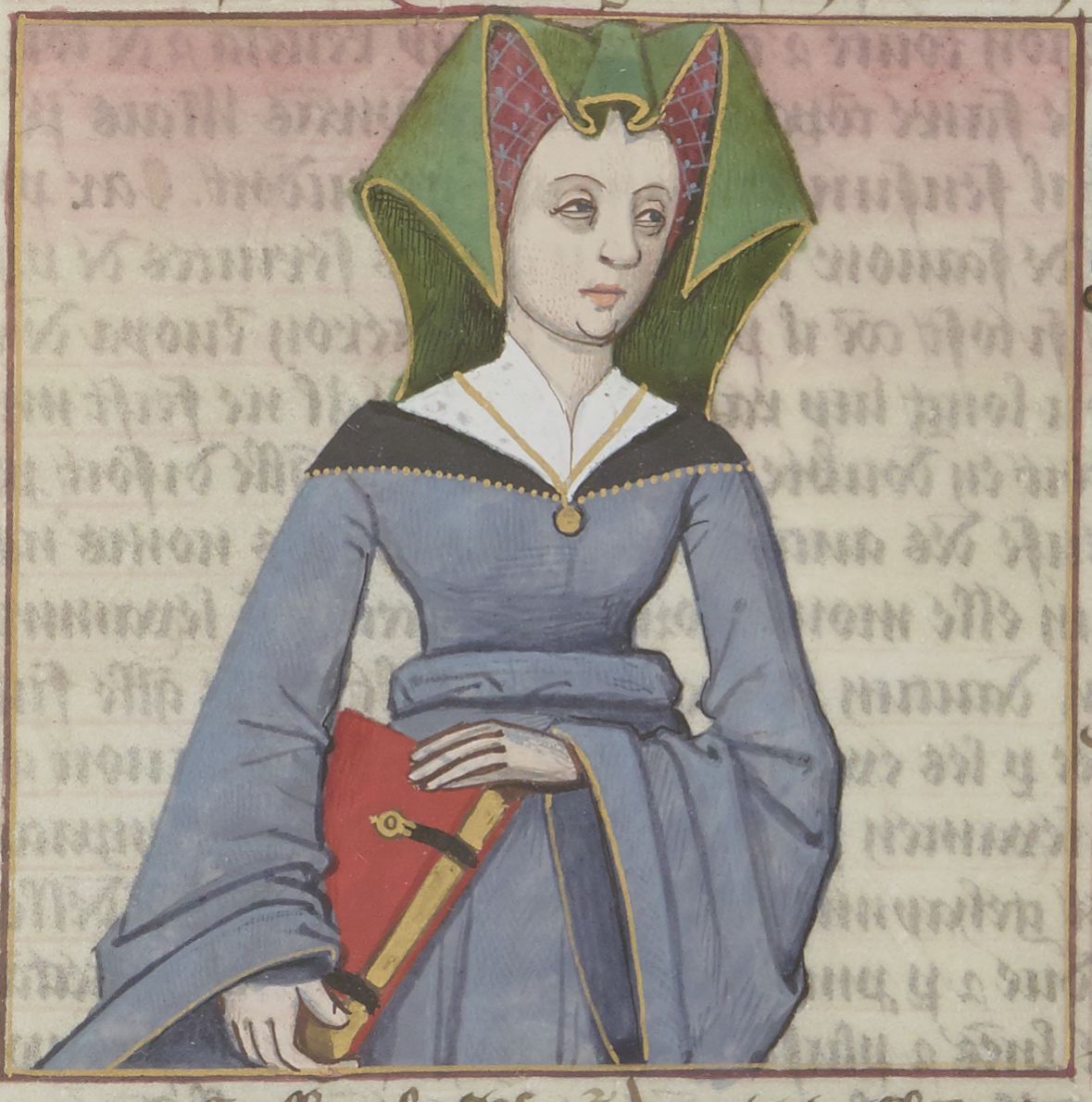 Parigi, Bibliothèque Nationale de France, Fr. 599, f. 80v. Il copista del manoscritto è Johannes Michel. Pompea Paolina, moglie di Seneca, con un libro.