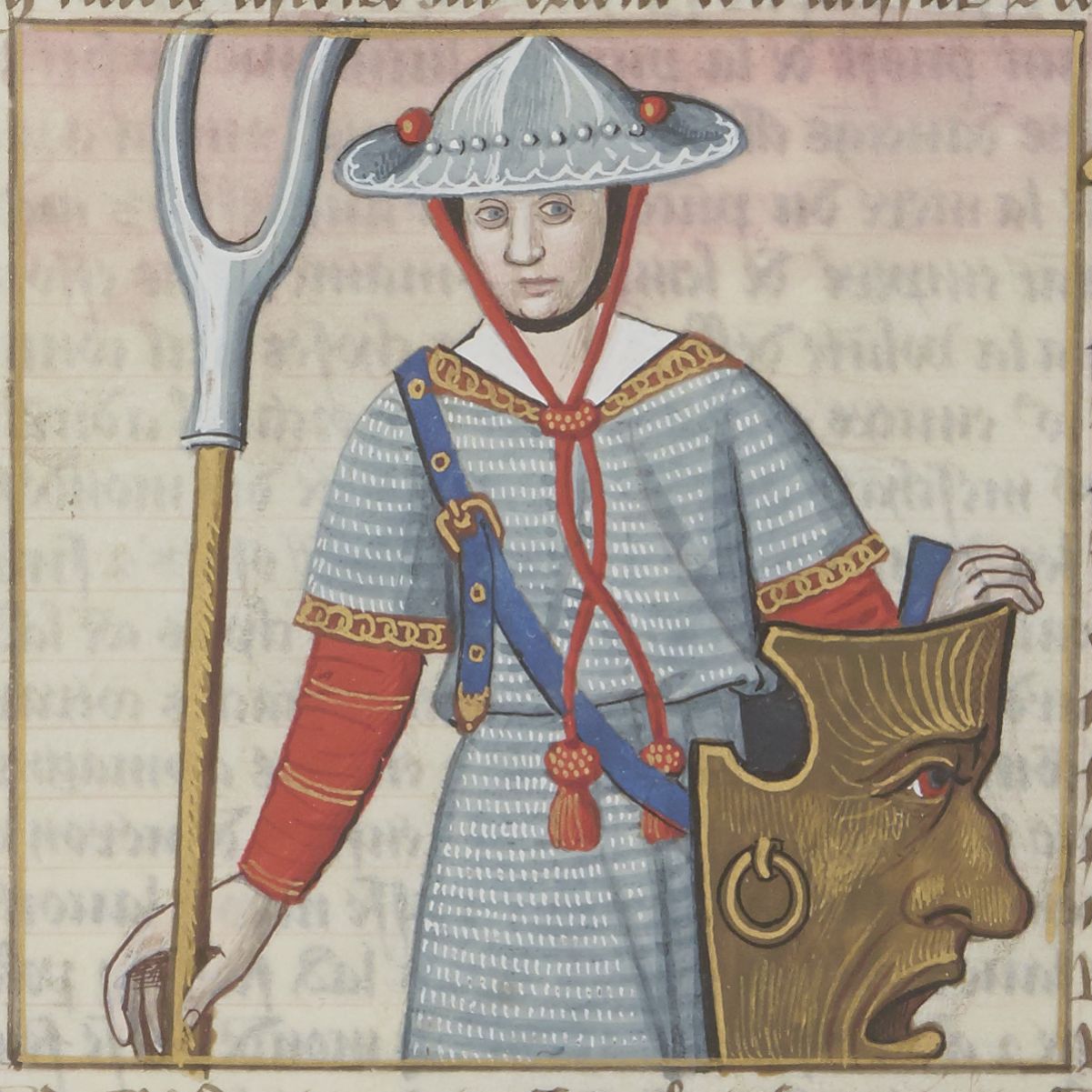 Parigi, Bibliothèque Nationale de France, Fr. 599, f. 82v. Il copista del manoscritto è Johannes Michel. Triaria armata di una forca e uno scudo.