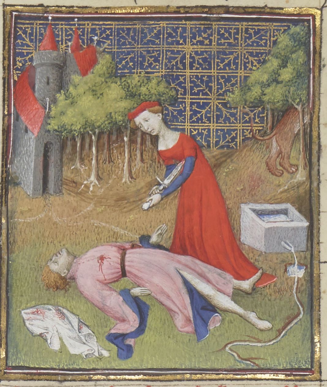 Parigi, Bibliothèque Nationale de France, Fr. 12420, f. 20r. Tisbe compie il suicidio accanto al corpo di Piramo; una leonessa fugge tra gli alberi.