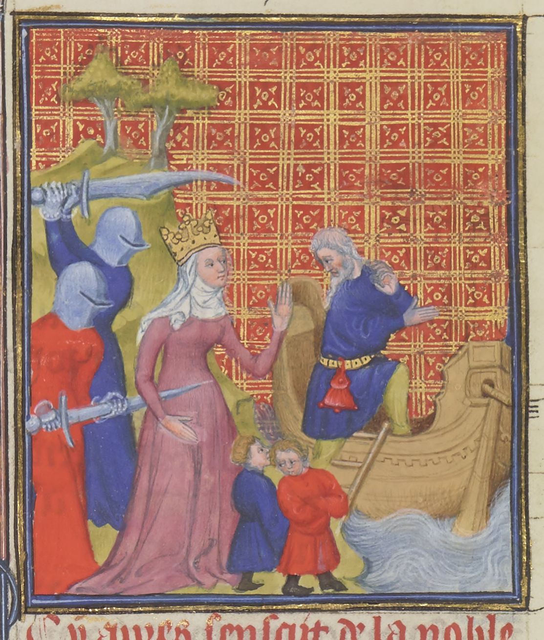 Parigi, Bibliothèque Nationale de France, Fr. 12420, f. 25r. Isifile, accompagnata dai due giovani figli, aiuta il padre Toante a fuggire per nave, mentre viene raggiunta dalle donne di Lemno armate di spade.