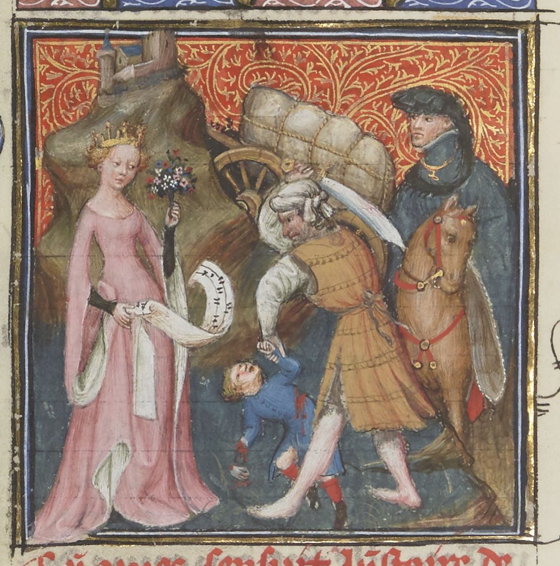 Parigi, Bibliothèque Nationale de France, Fr. 12420, f. 26v. Prima di fuggire a cavallo con Giasone, Medea fa uccidere il fratello Apsirto.