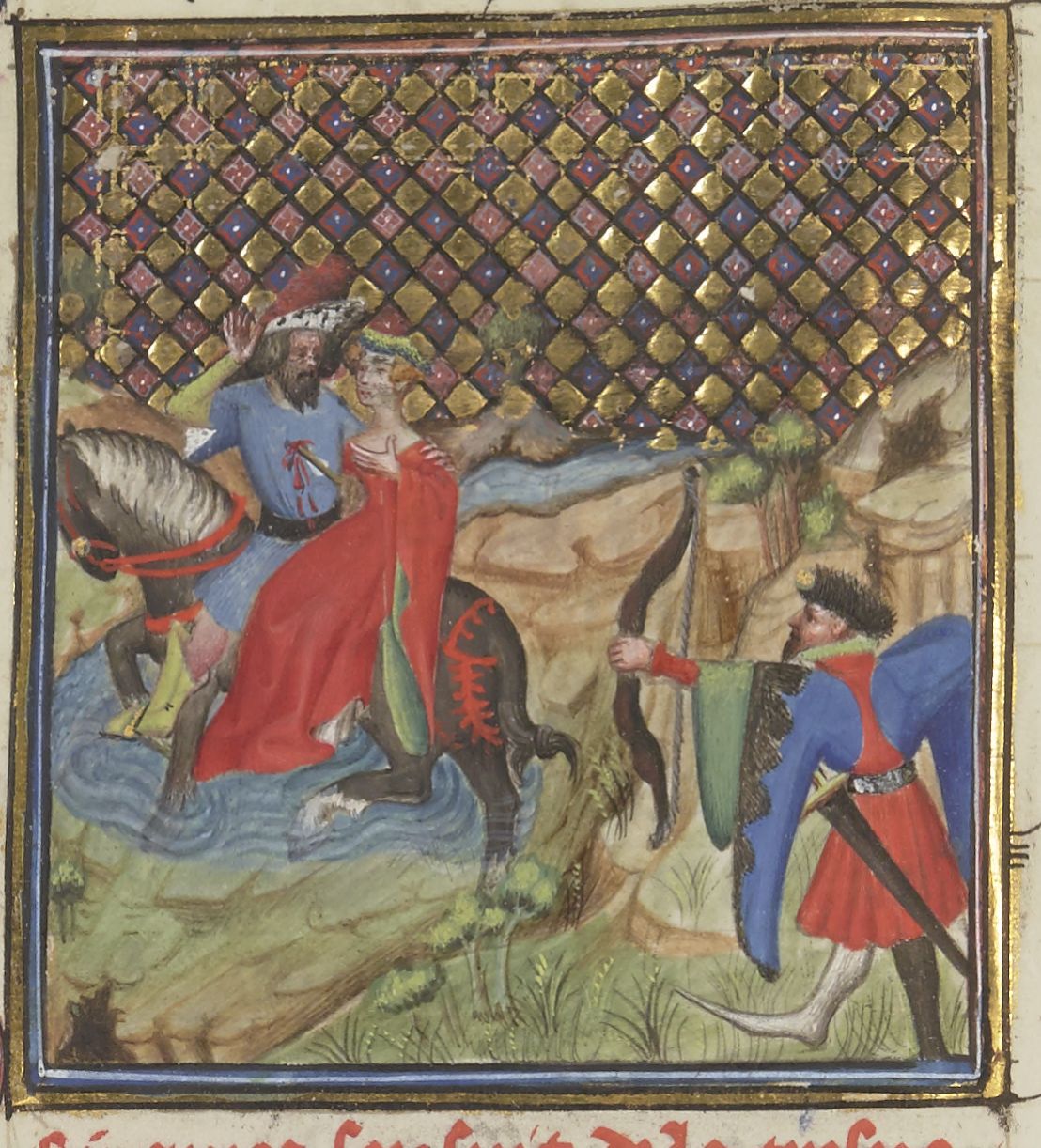 Parigi, Bibliothèque Nationale de France, Fr. 12420, f. 34v. Ercole scocca una freccia contro il centauro Nesso, il quale fugge guadando il fiume dopo aver rapito Deianira.