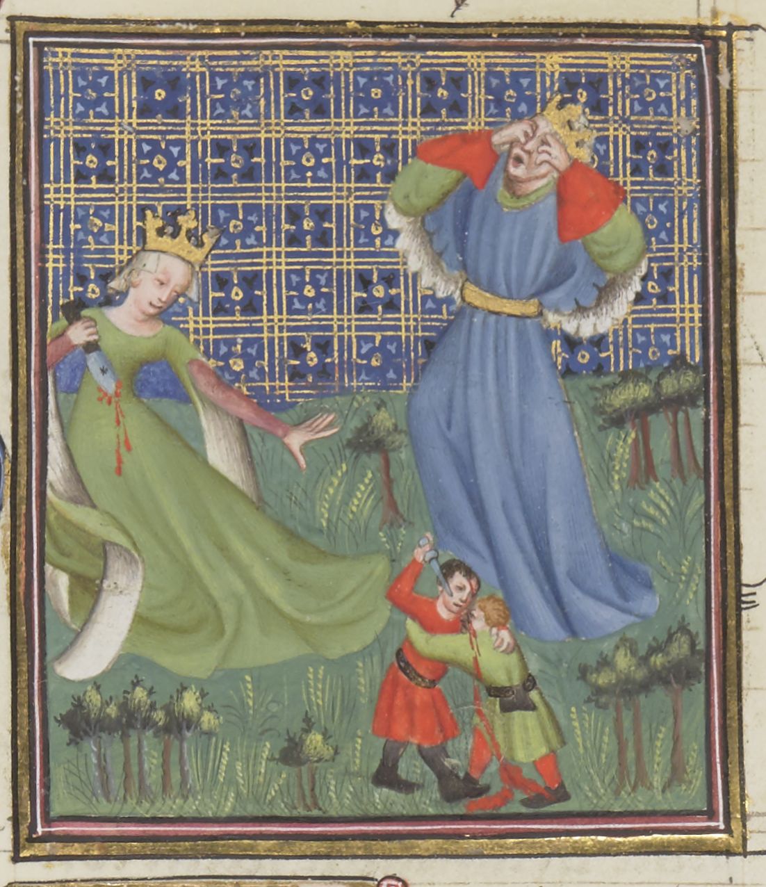 Parigi, Bibliothèque Nationale de France, Fr. 12420, f. 35r. Giocasta compie il suicidio; Edipo si cava gli occhi; Eteocle e Polinice si uccidono a vicenda.
