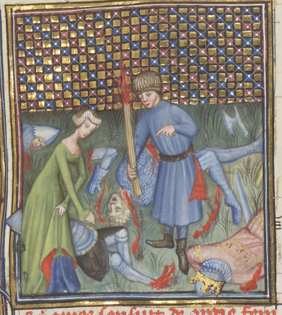 Parigi, Bibliothèque Nationale de France, Fr. 12420, f. 41r. Argia cerca il corpo del marito tra i cadaveri sul campo di battaglia.